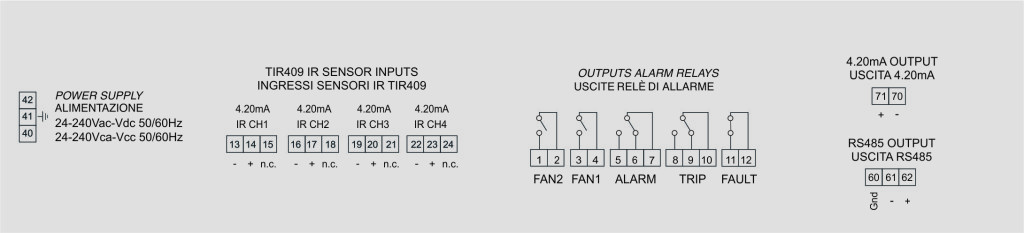 En salida están disponibles los relés para la gestión de alarma (ALARM), disparo (TRIP), control de ventilación (FAN1 – FAN2) y señalización de fallo (FAULT).